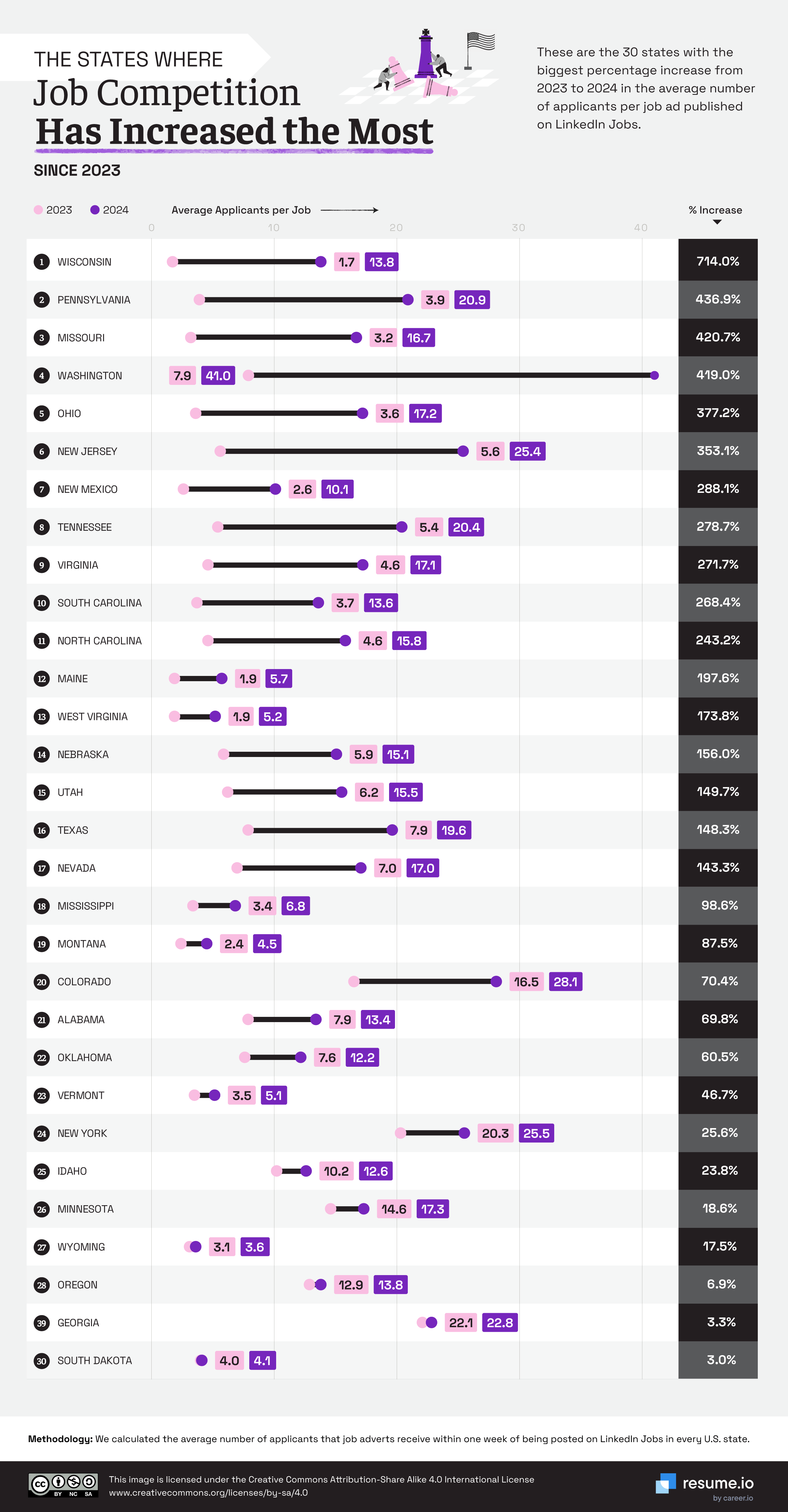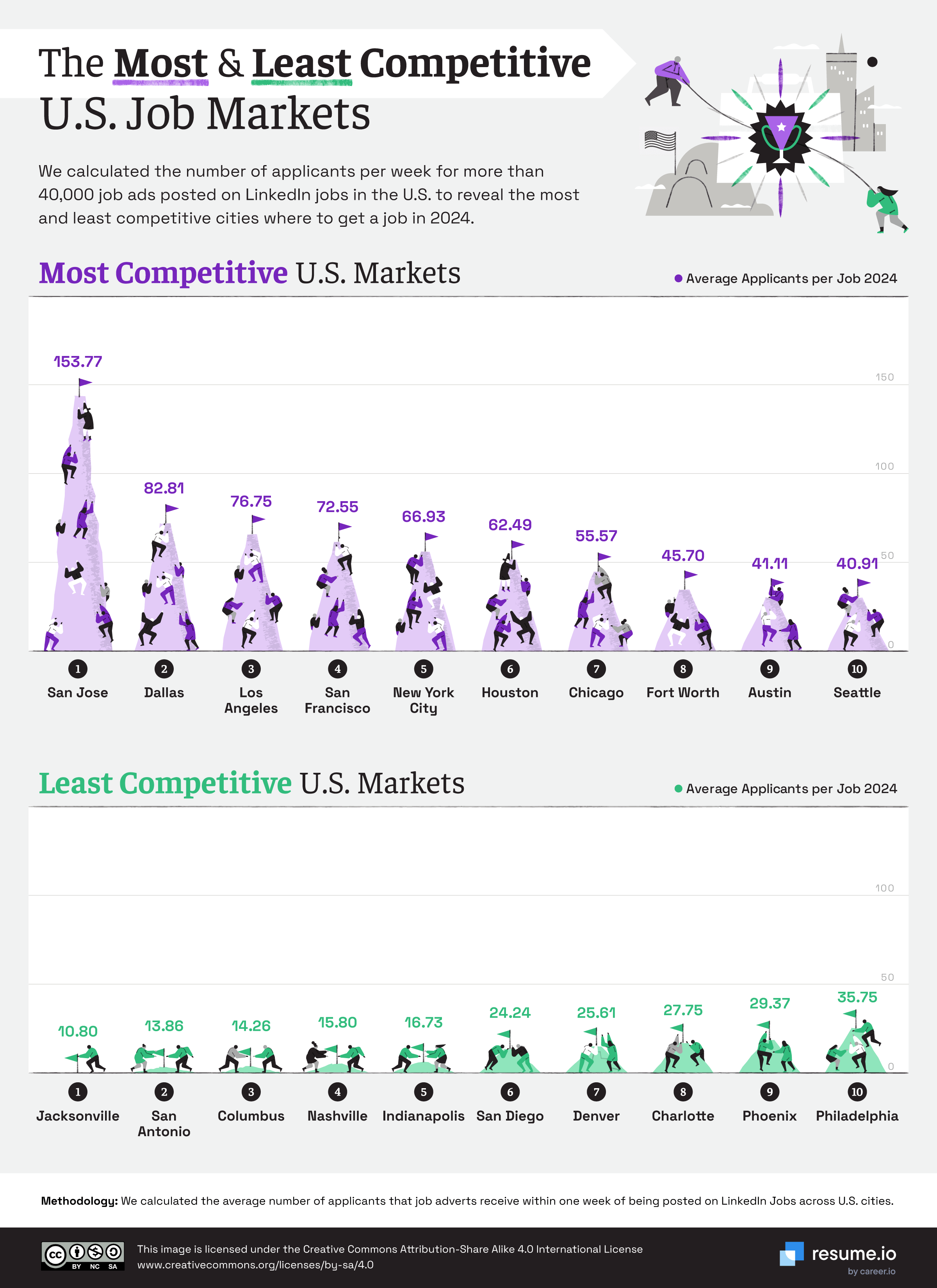 The team at resume.io wanted to know where America's toughest job markets are, so they worked out the average number of applicants that LinkedIn job ads received within one week of being posted, across US cities and states.