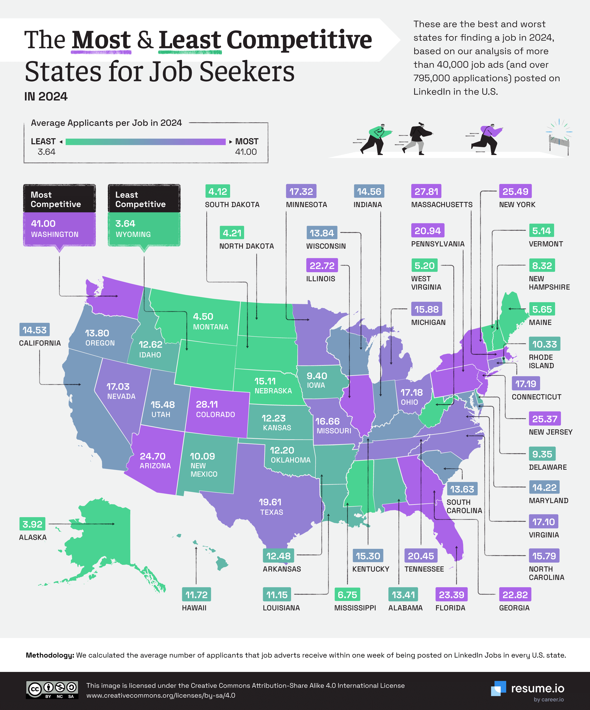 On the state level, Washington has the toughest job market overall, with 41 applicants per job ad, while Wyoming is the least competitive, with just 3.64.