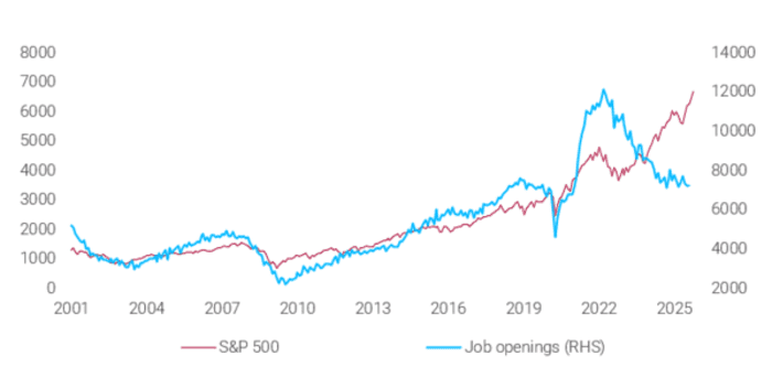 The chart, shown below, plots the trajectory of the S&P 500 against the number of job openings reported by the Labor Department’s monthly job openings and labor turnover survey. To some, it could look like evidence that the rise of AI — which has propelled the U.S. stock market to dizzying heights — has coincided with a deterioration in the labor market.